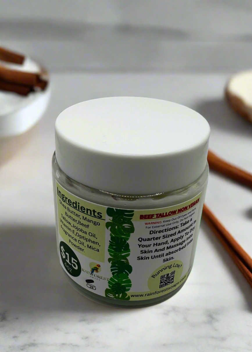 Ingredients: Shea Butter, Mango Butter, Beef tallow, Vitamin E Oil, Jojoba Oil, Fragrance Oil, Optiphen(Natural Preservative), Mica Powder(color).