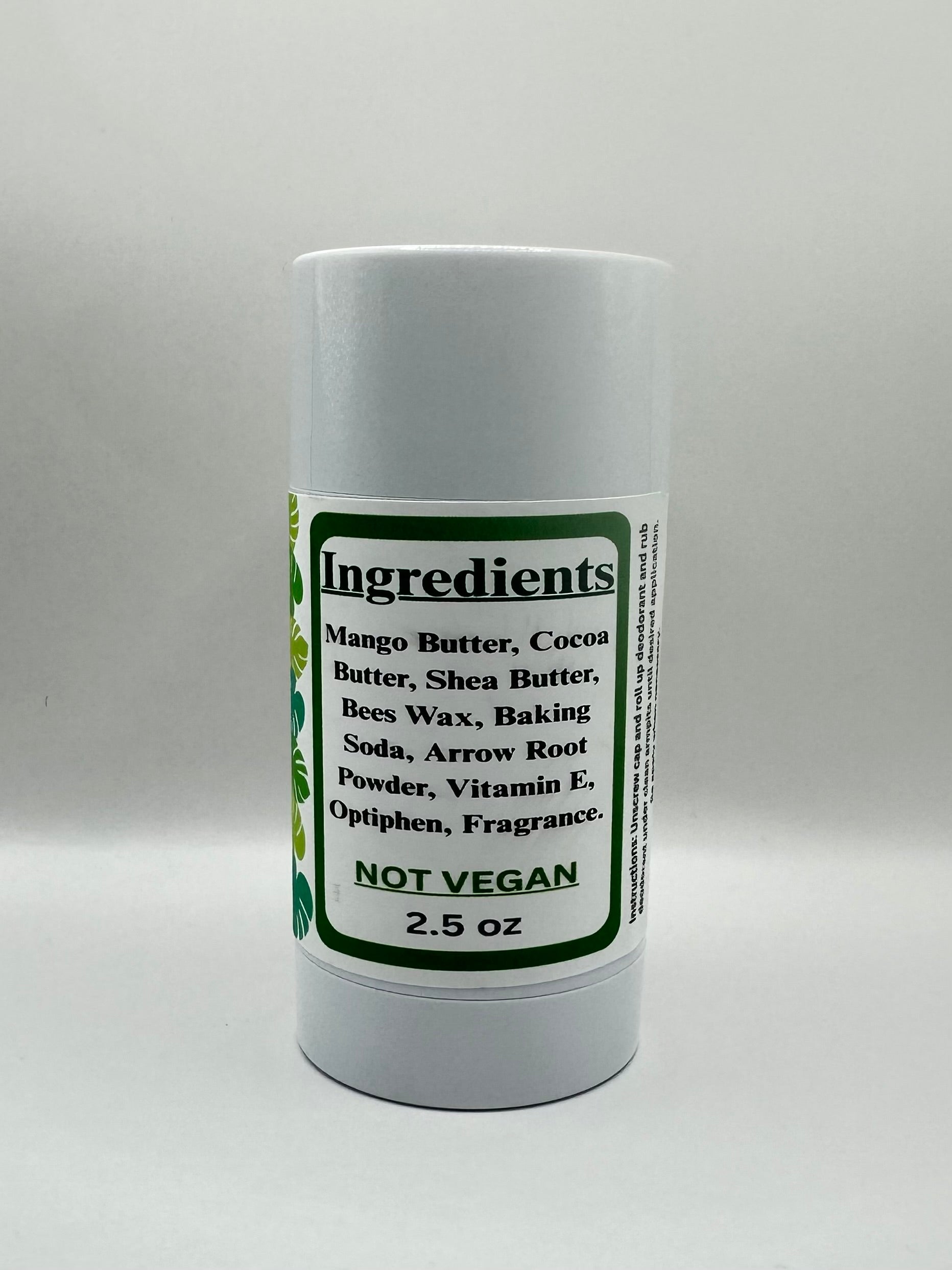 Ingredients: Mango Butter, Cocoa Butter, Shea butter, Bees Wax, Baking Soda, Arrow Root Powder, Vitamin E, Optiphen ( natural preservative) Fragrance.
