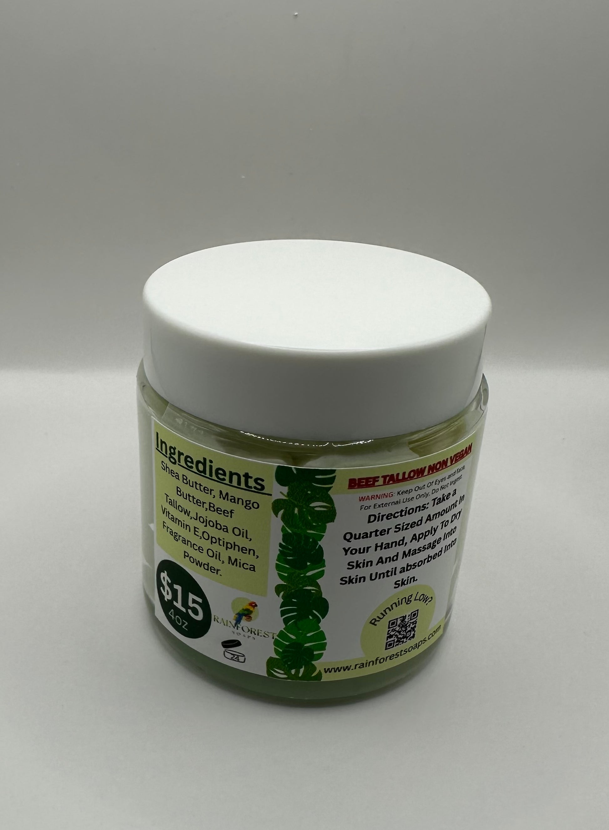 Ingredients: Shea Butter, Mango Butter, Beef tallow, Vitamin E Oil, Jojoba Oil, Fragrance Oil, Optiphen(Natural Preservative), Mica Powder(color).